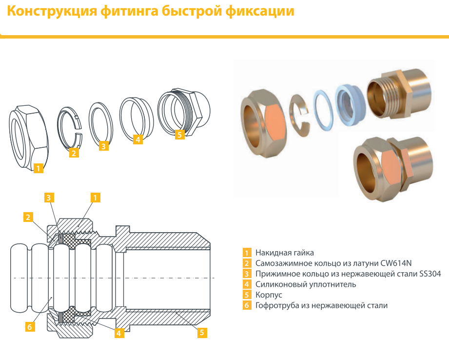 - Материал фитинга и фиксирующего кольца: Латунь CW617N.