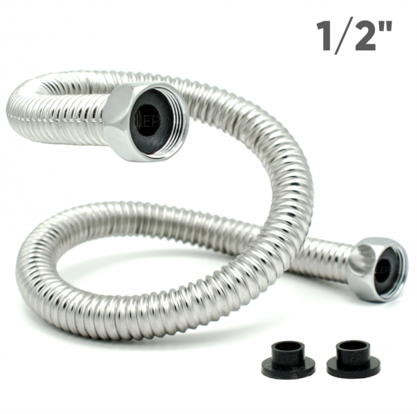 - При изготовлении гибкой подводки на 1/2" используется отожженная труба из гофрированной нержавеющей стали SS304 с толщиной стенки 0,3мм и накидные хромированные гайки.
