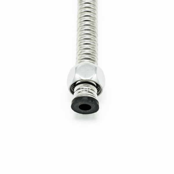 - При изготовлении гибкой подводки на 3/4" используется отожженная труба из гофрированной нержавеющей стали SS304 с толщиной стенки 0,3мм, накидные хромированные гайки и никелированный ниппель.