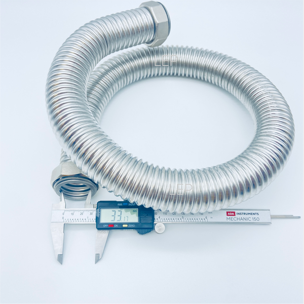 - При изготовлении гибкой подводки на 1 1/2" используется отожженная труба из гофрированной нержавеющей стали SS304 с толщиной стенки 0,3мм,накидные латунные никелированные гайки и стопорные кольца из нержавеющей стали.