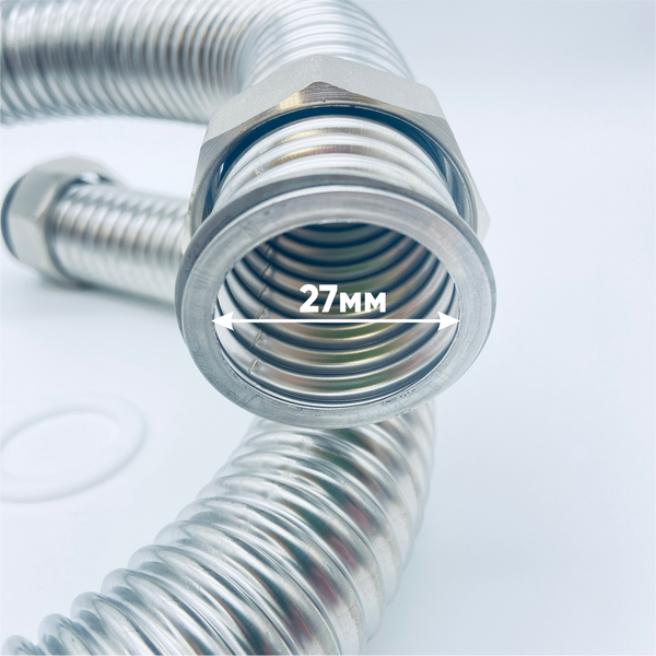 - При изготовлении гибкой подводки на 1 1/4" используется отожженная труба из гофрированной нержавеющей стали SS304 с толщиной стенки 0,3мм,накидные латунные никелированные гайки и стопорные кольца из нержавеющей стали.