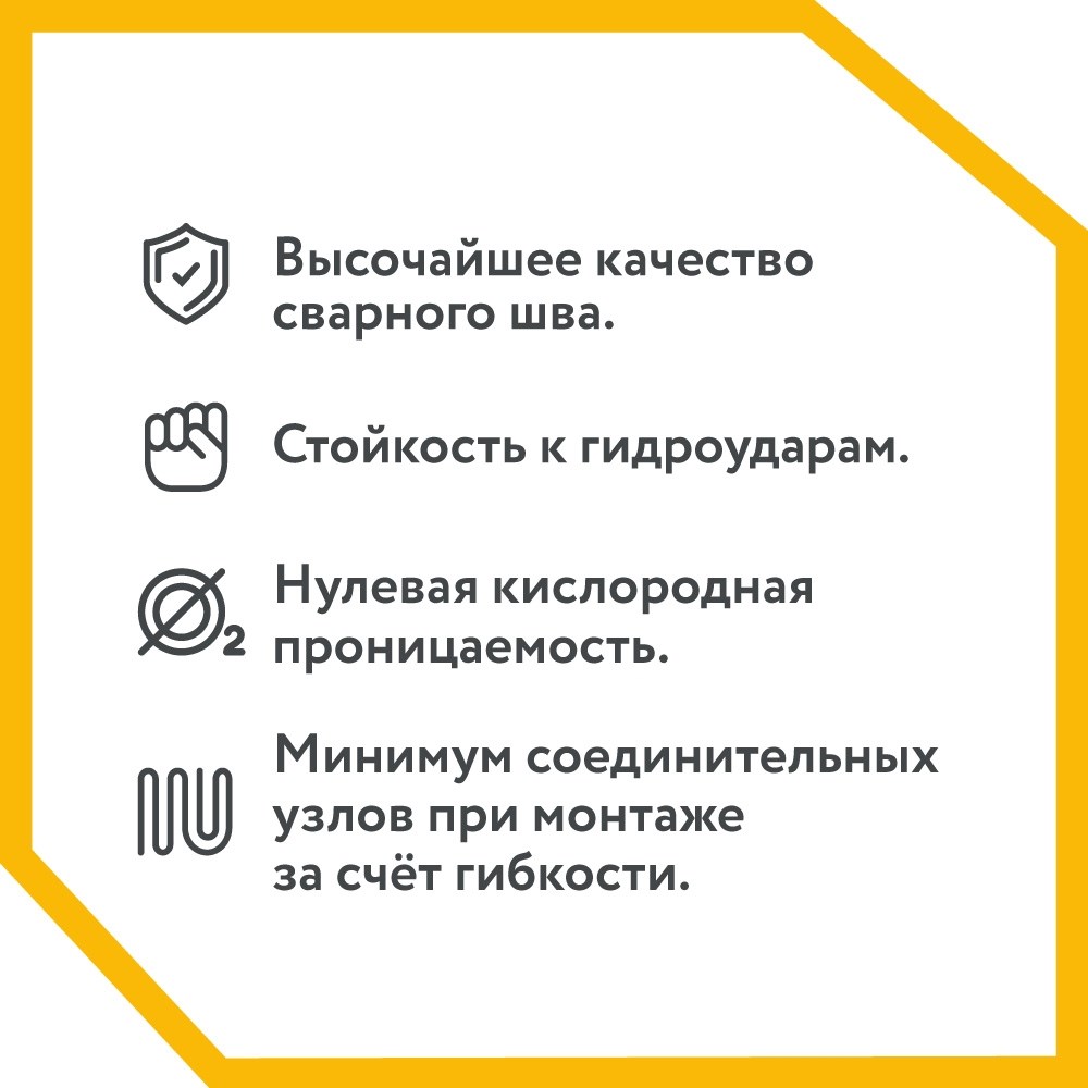 - Непревзойденная гибкость - допустимый радиус изгиба – 2d! Дает возможность прокладки трасс со сложной геометрией, недостижимой для других типов труб.