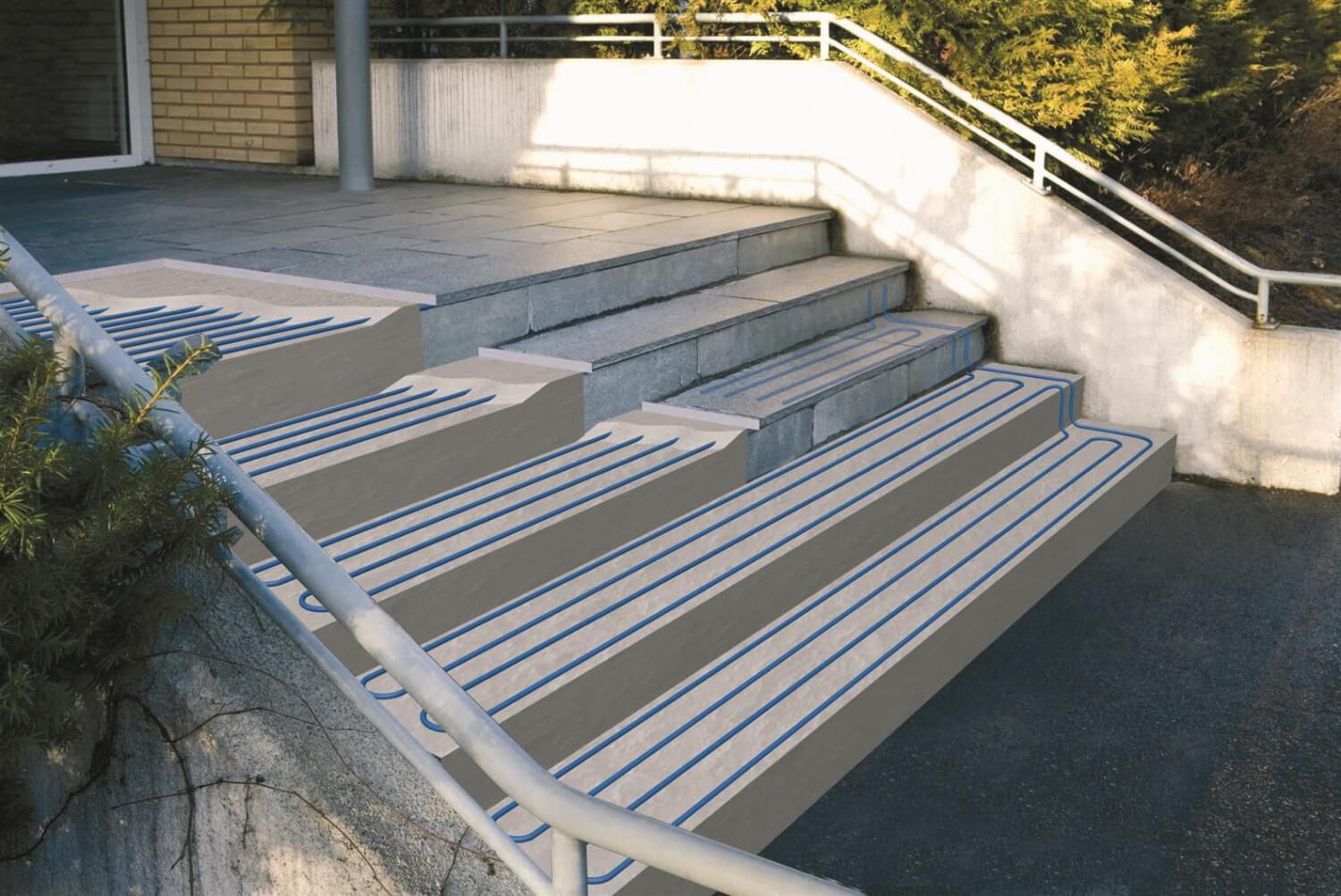 - Возможно также применение секций в системах обогрева открытых площадей, при этом они устанавливаются непосредственно в цементно-песчаный раствор, слой плиточного клея или товарный бетон.