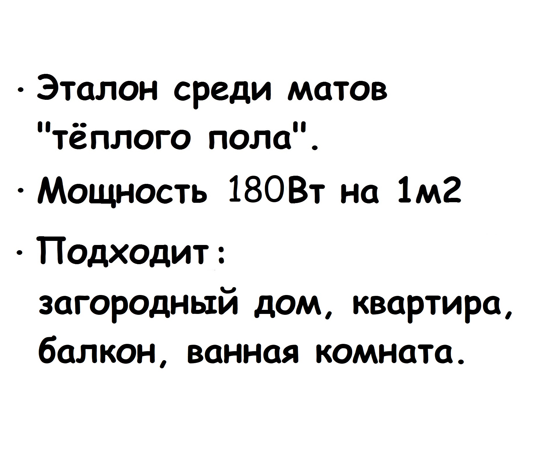 Маты сделаны на основе двухжильного экранированного греющего кабеля, который не создаёт электромагнитных полей.Маты мощностью 180Вт/м2 используются в качестве комфортного или основного обогрева под плитку или керамогранит.