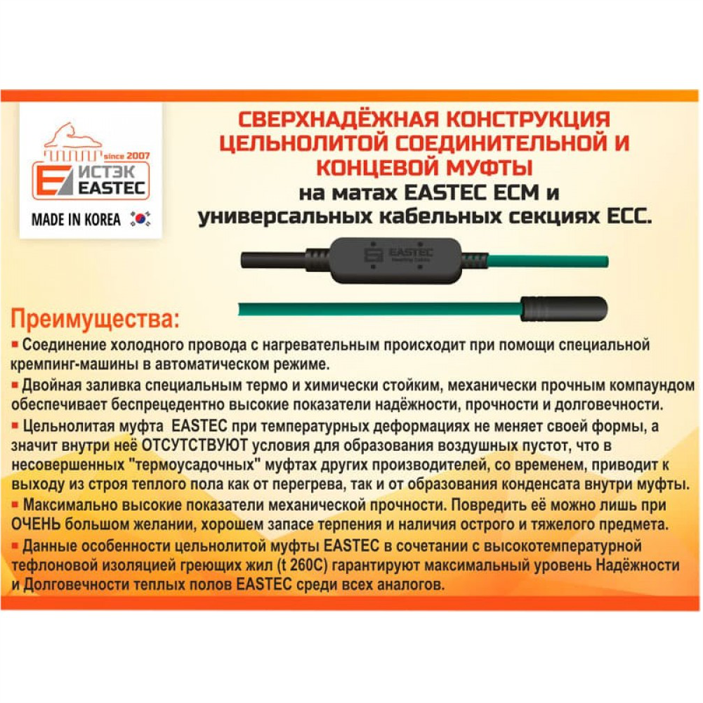 - Греющий кабель EASTEC и обе муфты обладают оригинальной сверхнадежной конструкцией и самым высоким запасом прочности среди всех аналогов.