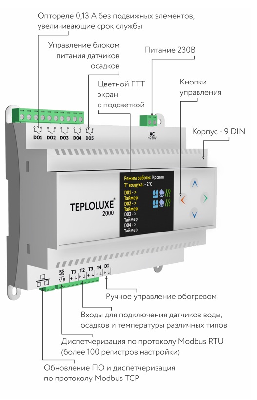 Контроллер Teploluxe 2000 используется для управления системами антиобледенения кровли и открытых площадок, обогрева трубопроводов и резервуаров, а также системами обогрева помещений (электрическими нагревательными кабелями, плёночными и другими электронагревателями).