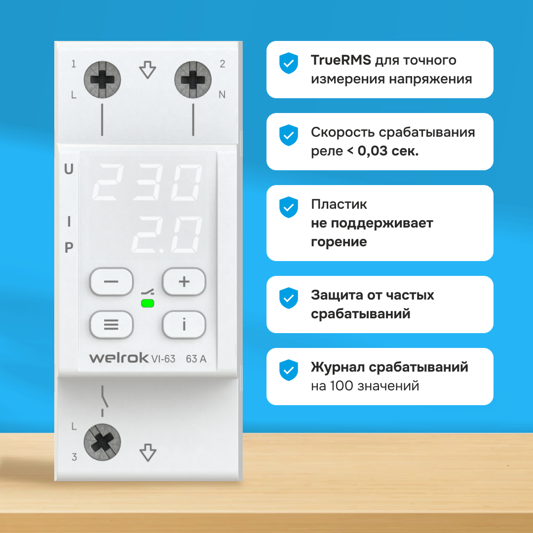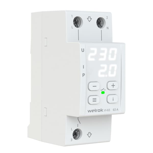 Реле напряжения с контролем тока Welrok VI-63 на DIN-рейку 63А 13,9кВт