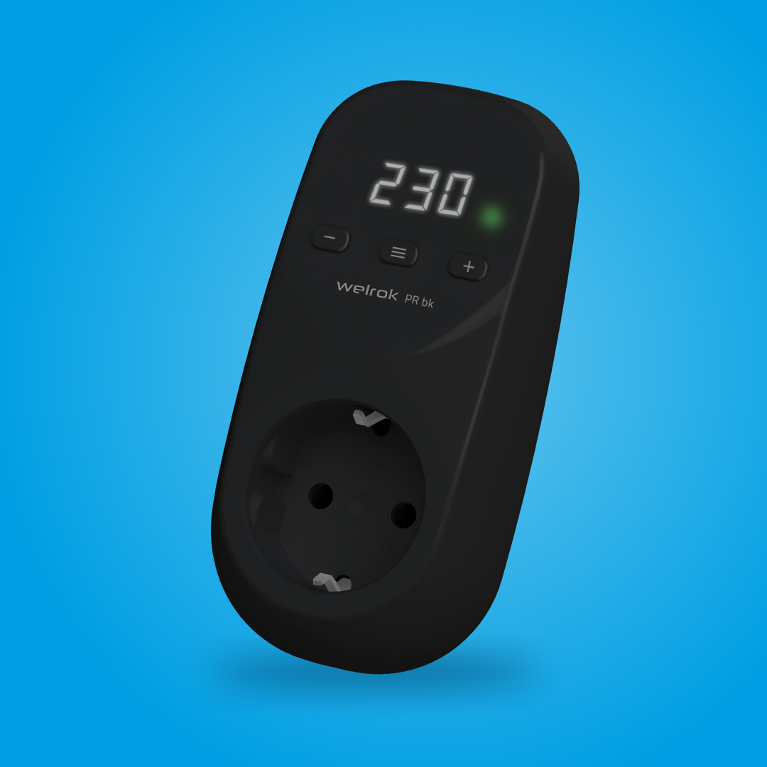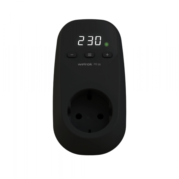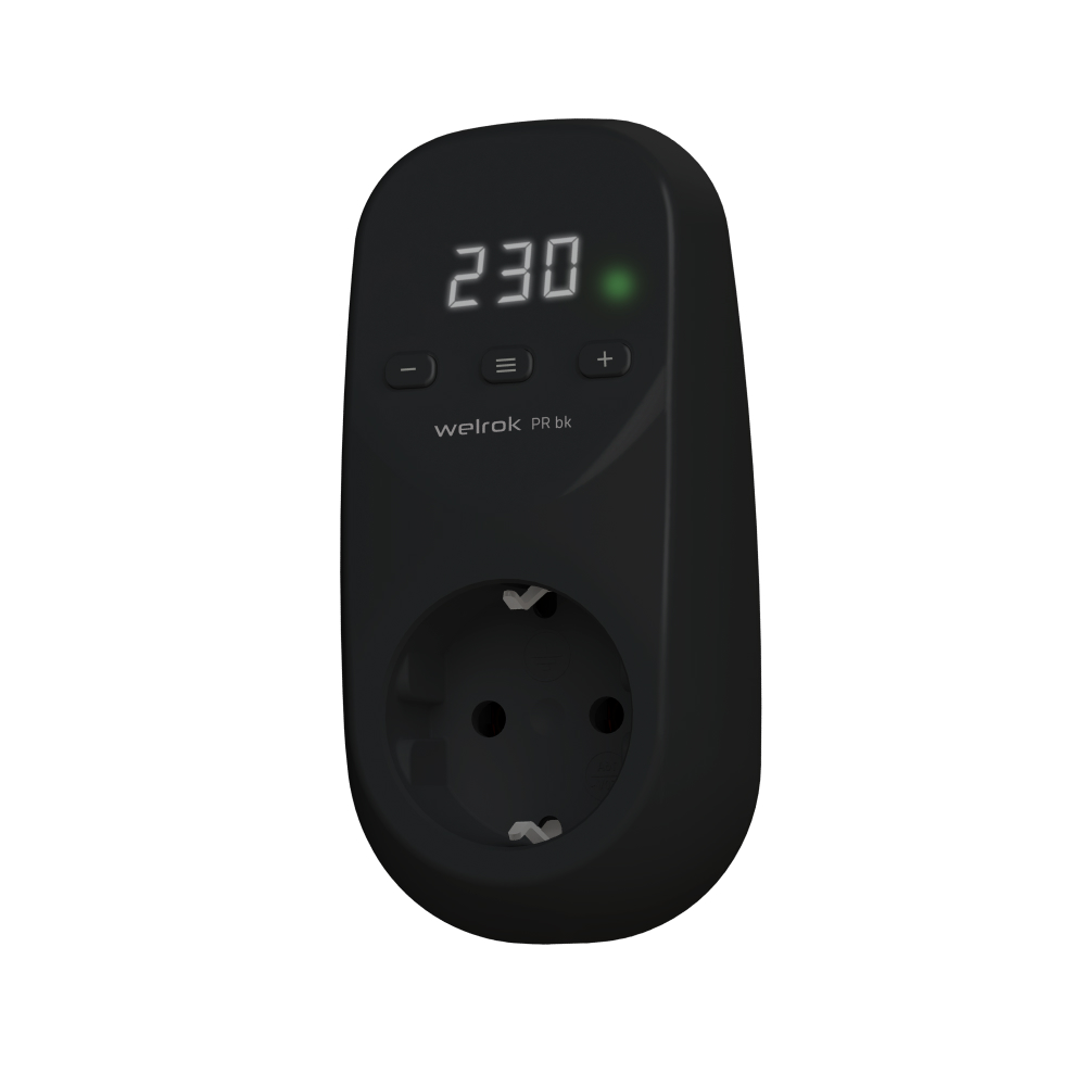 Welrok PR Bk — реле напряжения для защиты оборудования подключаемого в одну розетку имеет черный корпус и индикатор белого цвета с регулируемой яркостью свечения.