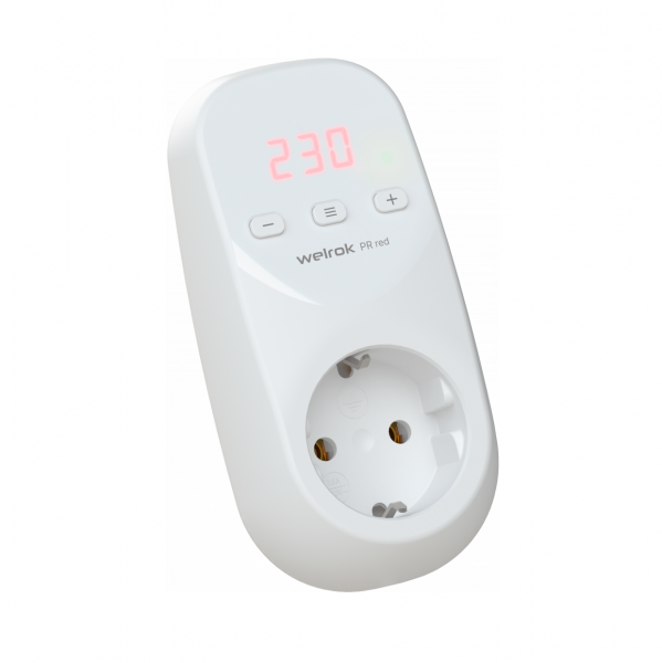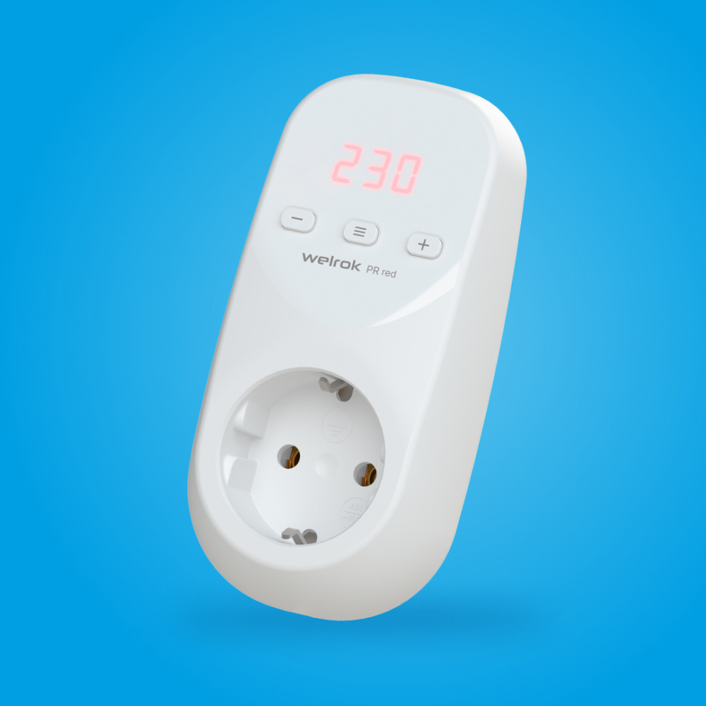 Welrok PR red — реле напряжения для защиты оборудования подключаемого в одну розетку имеет индикатор красного цвета с регулируемой яркостью свечения.